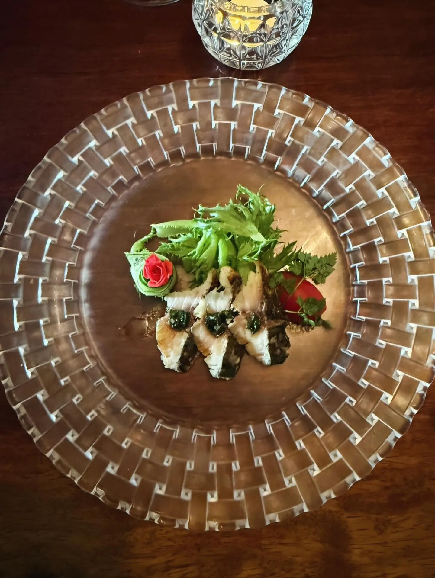 二品目、炙りシメサバの冷燻カルパッチョをご紹介します✨。軽く炙られたシメサバを、ほんのりと冷燻製法で仕上げ❄️、香り高く深みのある燻製醤油と爽やかなハーブソースが絶妙に絡み合っています。ペアリングに選んだワイン〈グレーコ〉の柑橘系の香り🍊が、この一皿の風味を一層引き立て、口の中に広がる余韻を豊かに演出します。