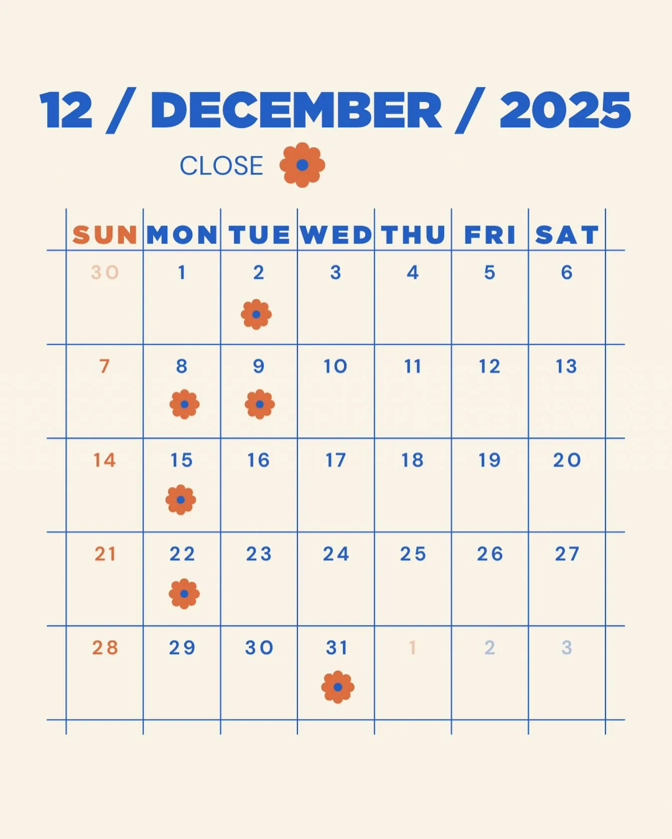 12/2(火).8(月).9(火).15(月).22(月).31(水)
